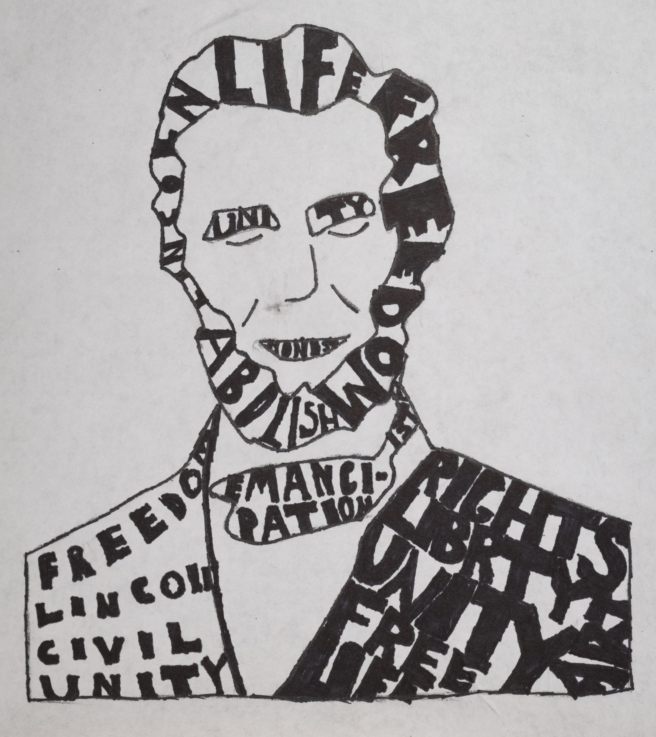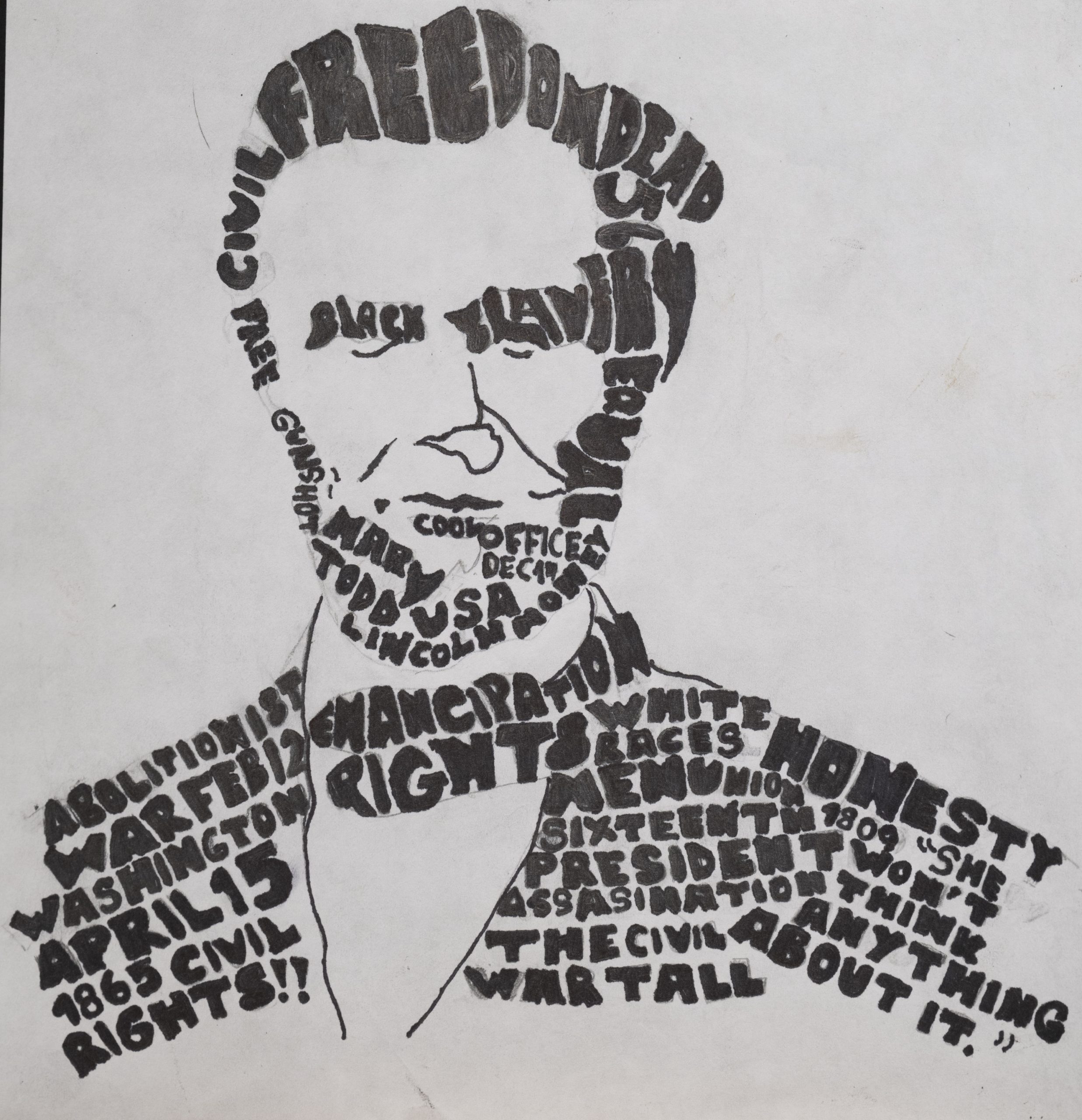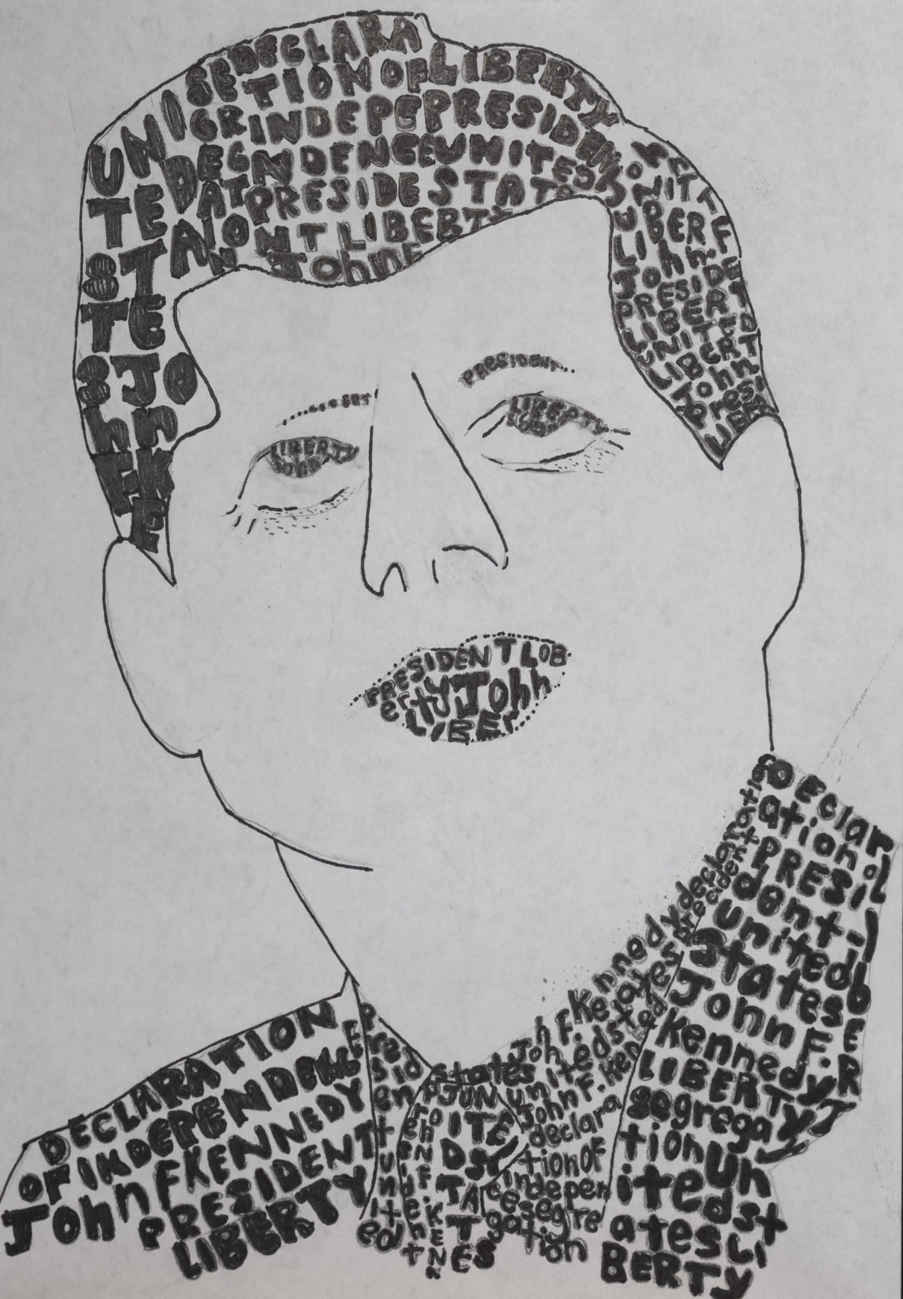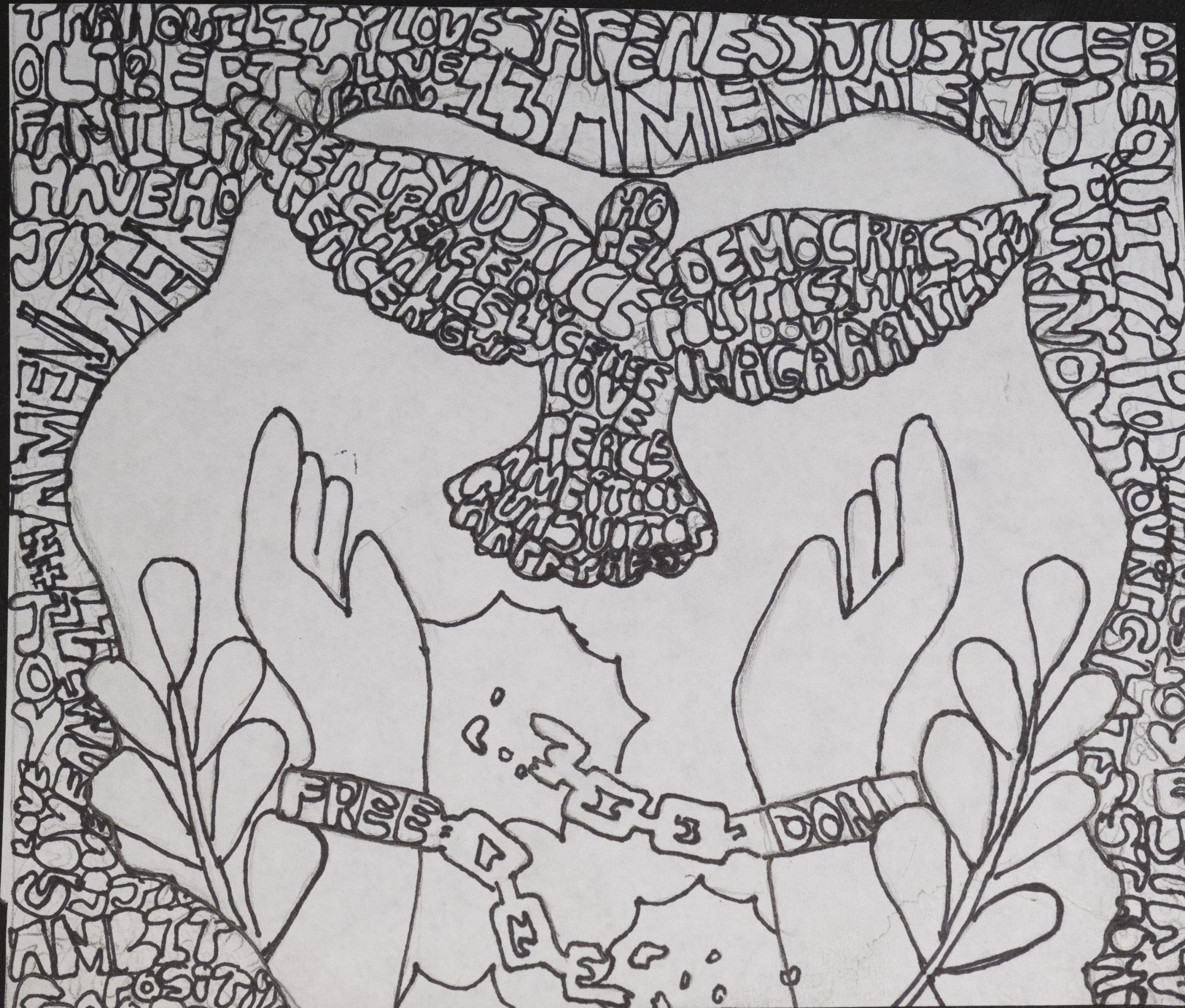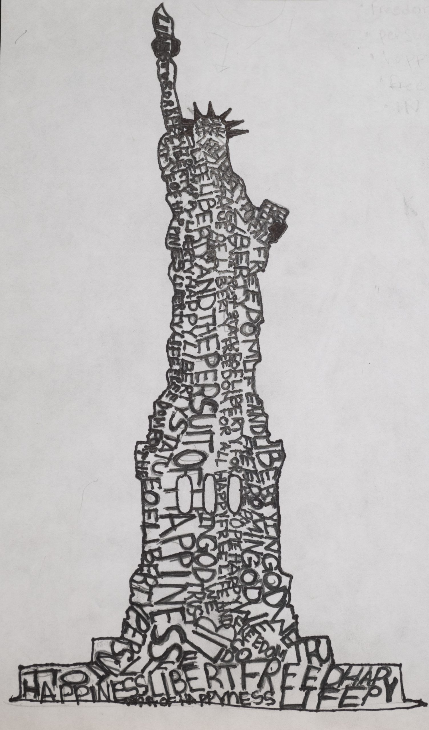 Students were asked to illustrate a famous section of the Declaration of Independence by focusing on one of the three main attributes discussed within, Life, Liberty, or the Pursuit of Happiness. Using the art technique of typography, students chose either a symbol or a civil rights leader, developed a vocabulary about that person or symbol, and created a two-dimensional work.
