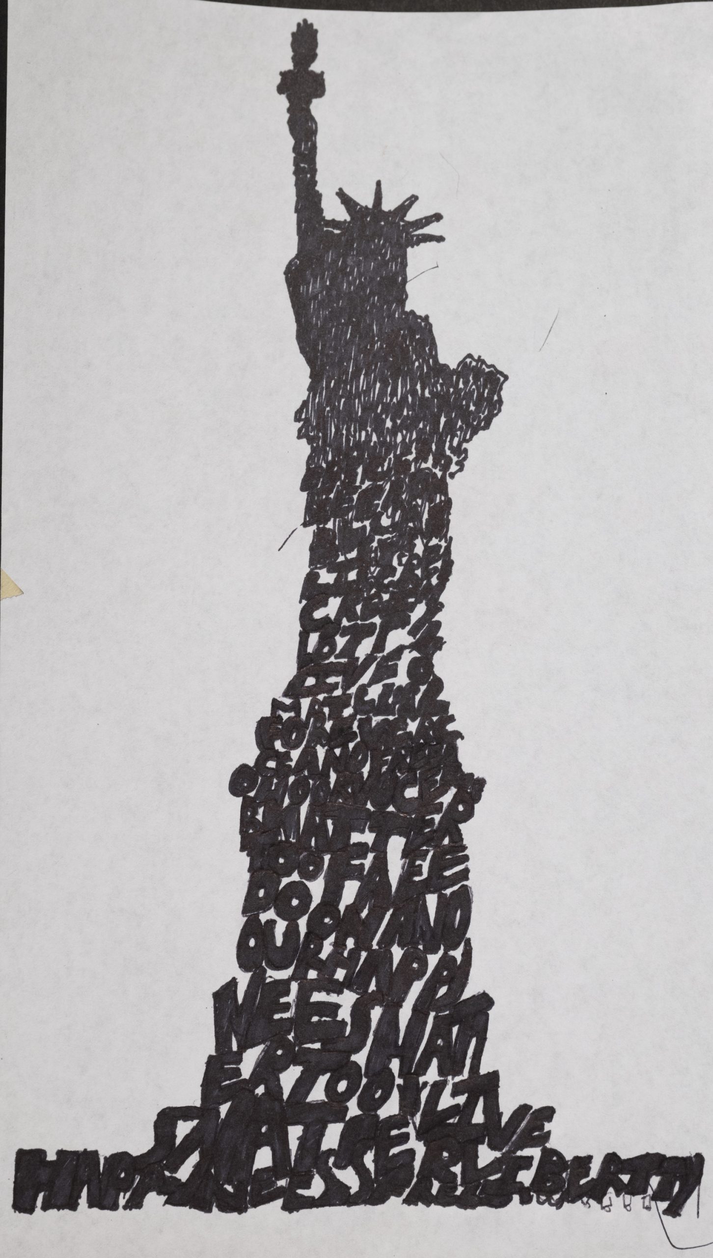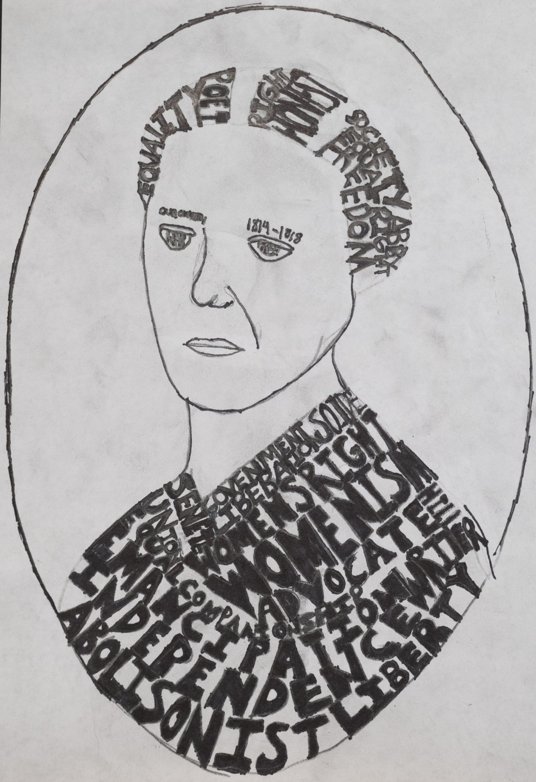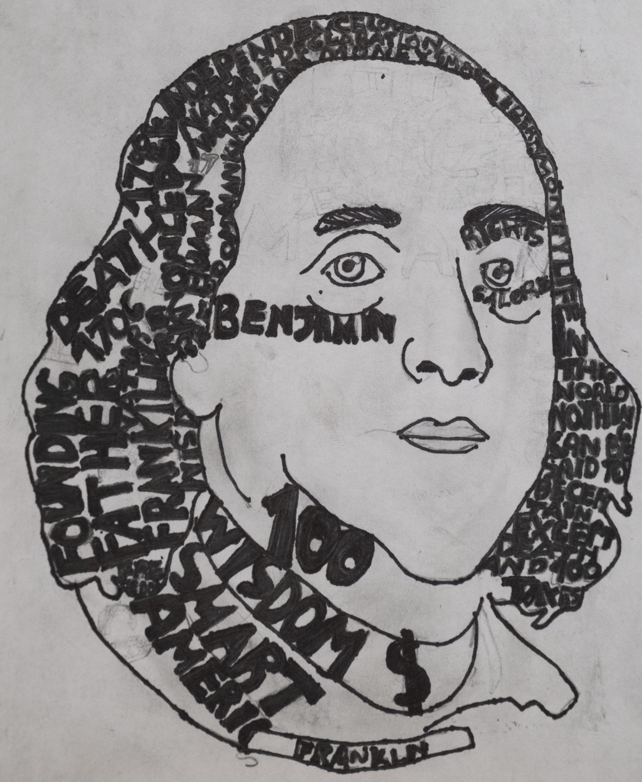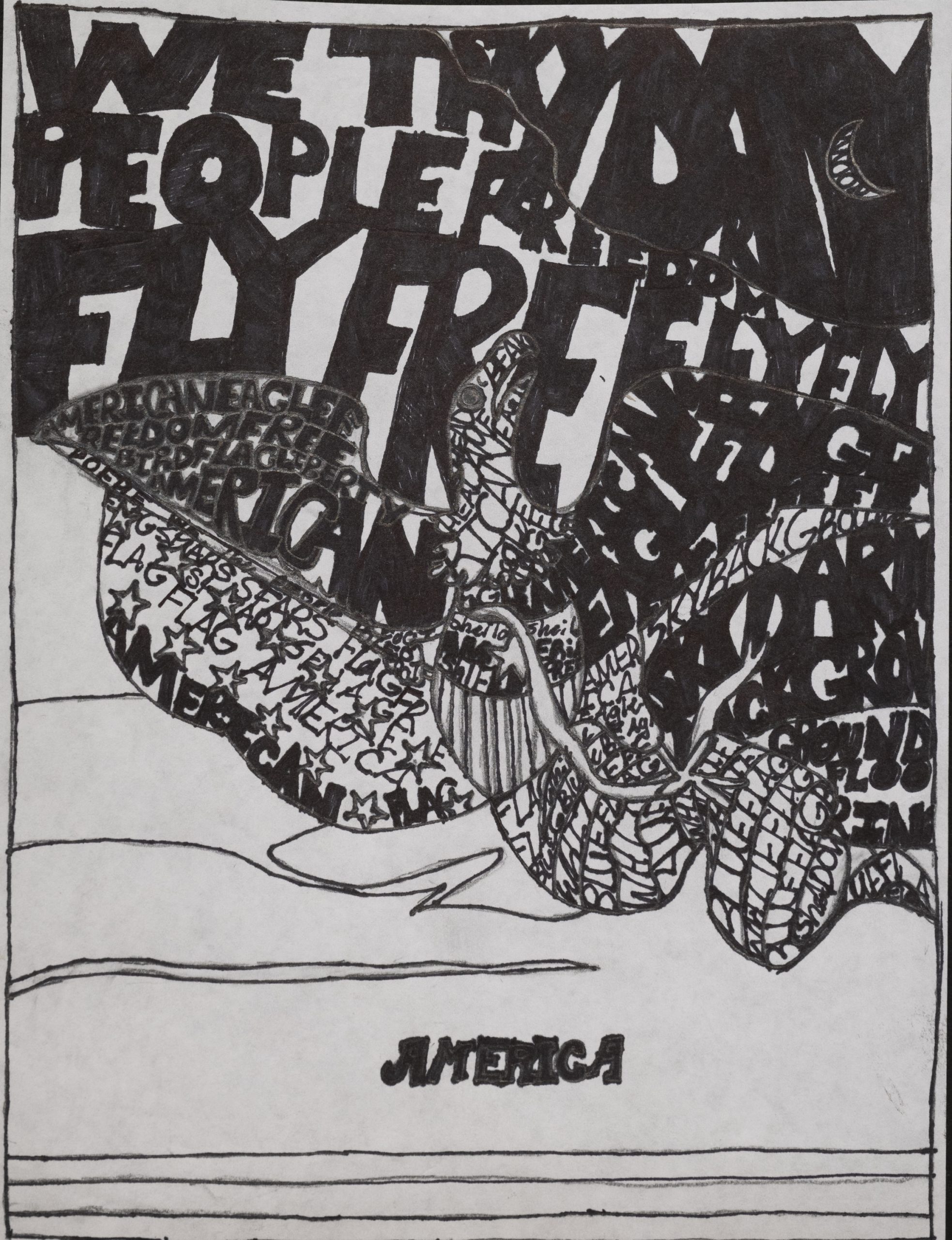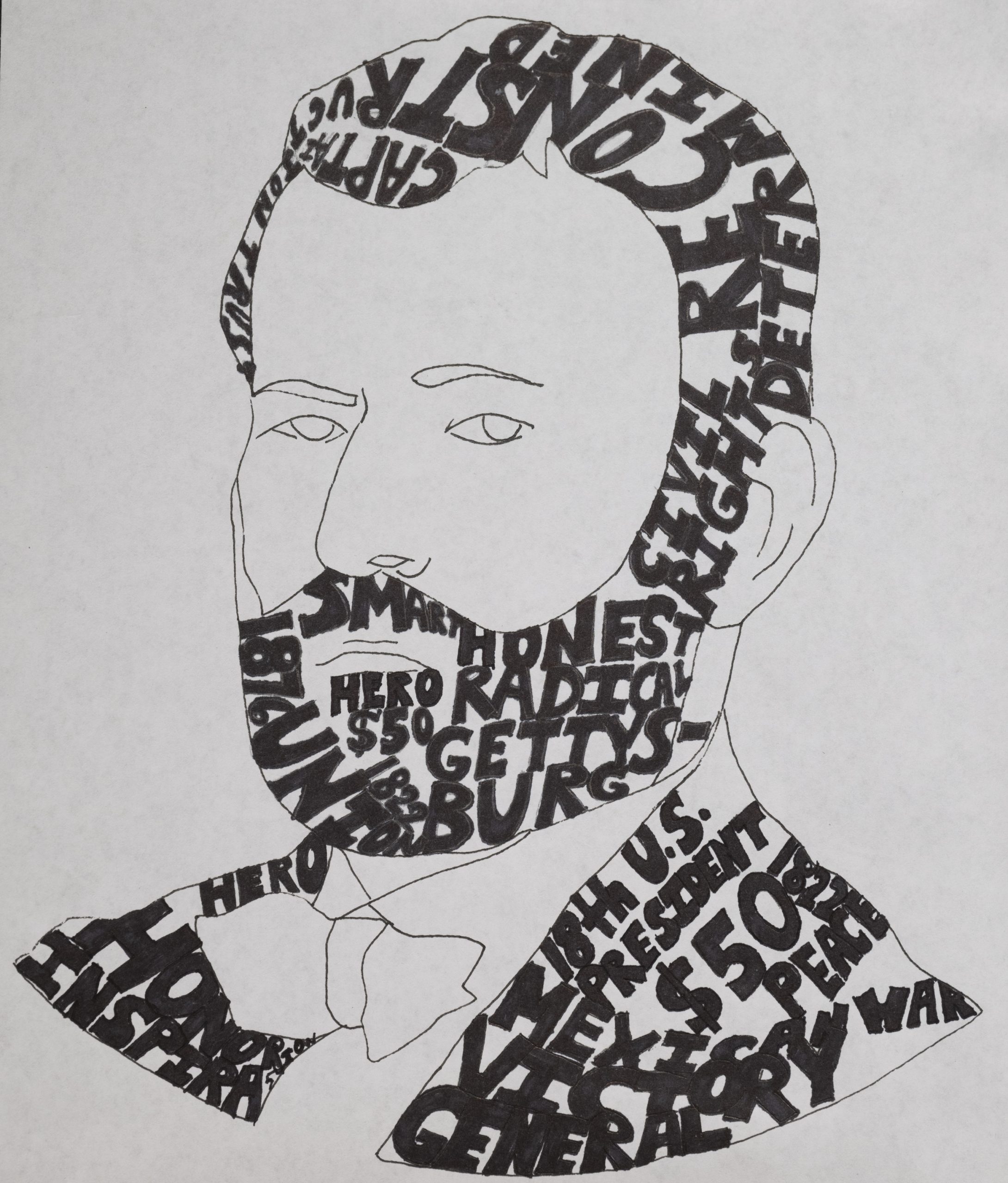 Students were asked to illustrate a famous section of the Declaration of Independence by focusing on one of the three main attributes discussed within, Life, Liberty, or the Pursuit of Happiness. Using the art technique of typography, students chose either a symbol or a civil rights leader, developed a vocabulary about that person or symbol, and created a two-dimensional work.