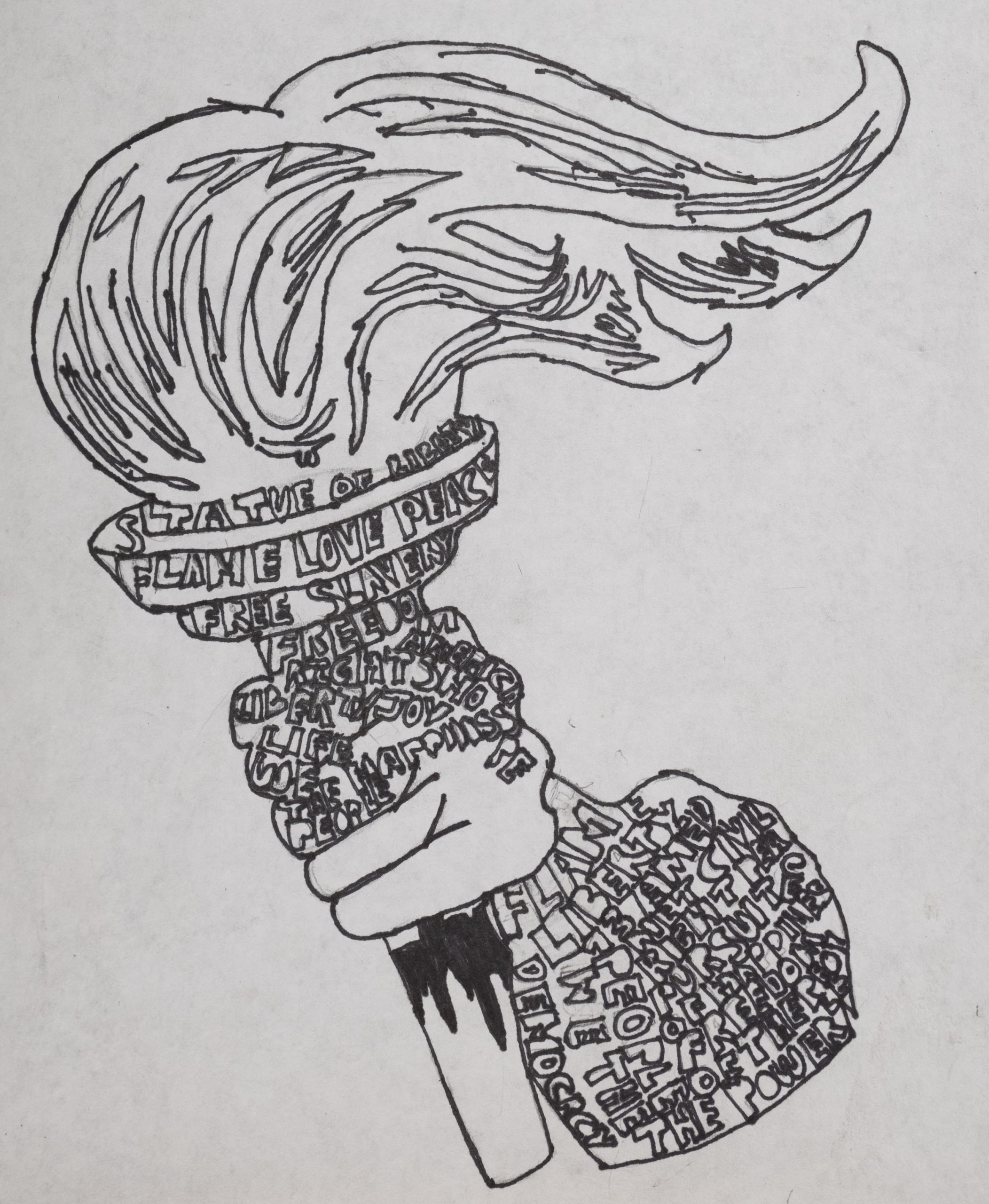 Artist researched the Declaration of Independence and thought of all the people that are protected. Artist combined pens, stencils, and paint to complete artwork.