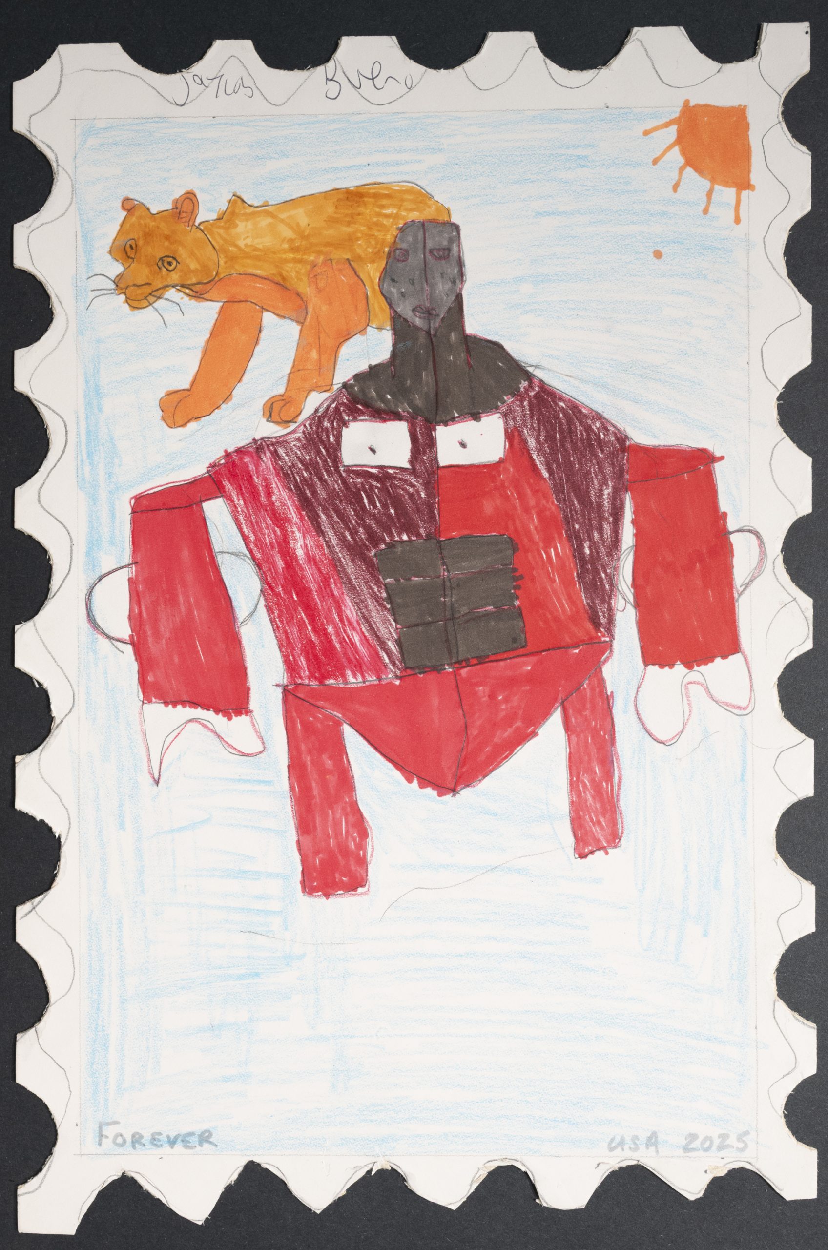 The artist drew himself on a postage stamp to express the demographic of the American people.