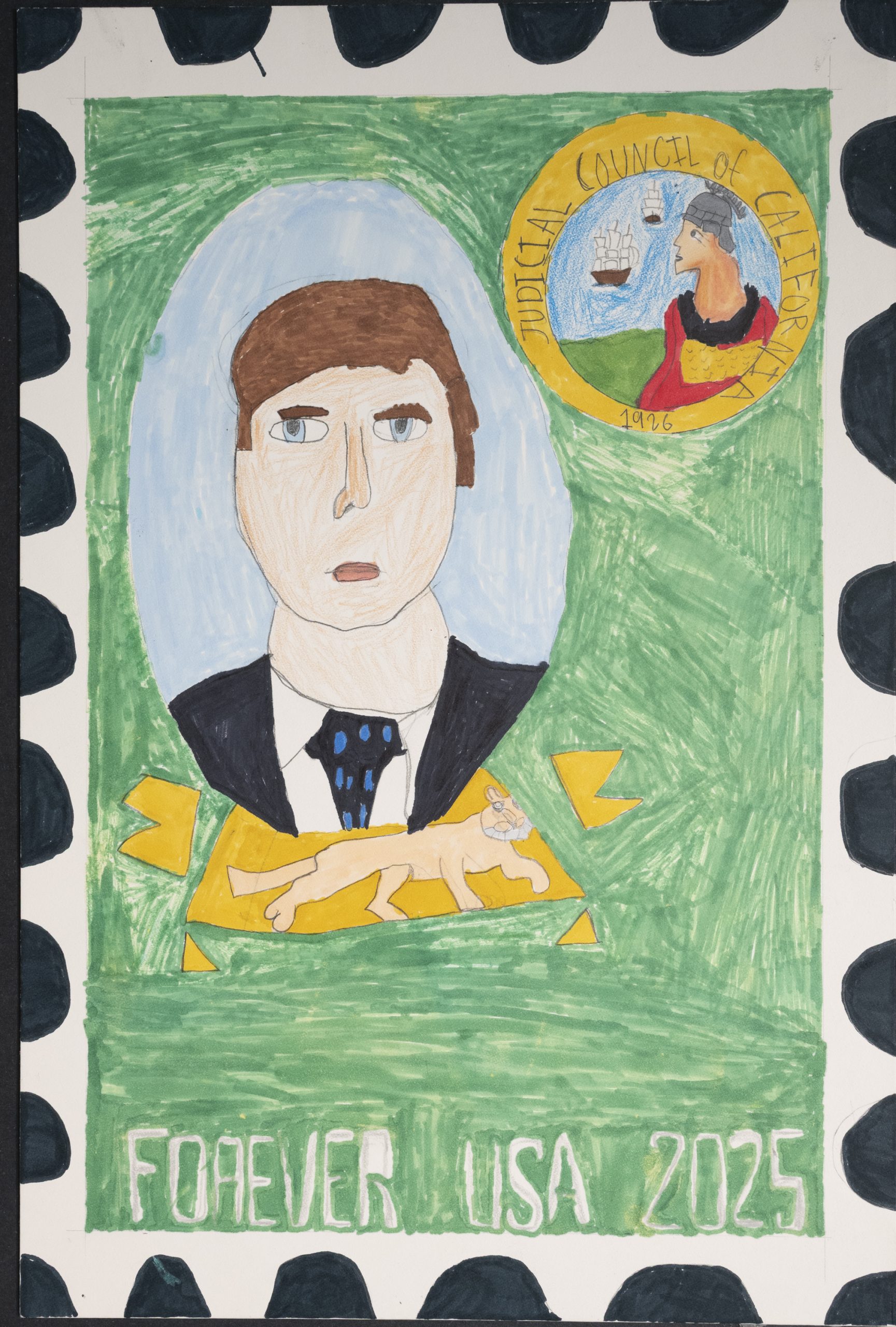 Students had the option to choose their own prompt from the four possibilities proposed by the Court civics subcommittee. Many students chose to focus on telling a story of a nation through stamps. Some explored visual design related to the naturalization process and were inspired by personal and family stories of gaining citizenship. Some students visually depicted text from the Declaration of lndependence. Some who are interested in design or architecture chose to explore the courtroom of the future. One student focused on art law cases.